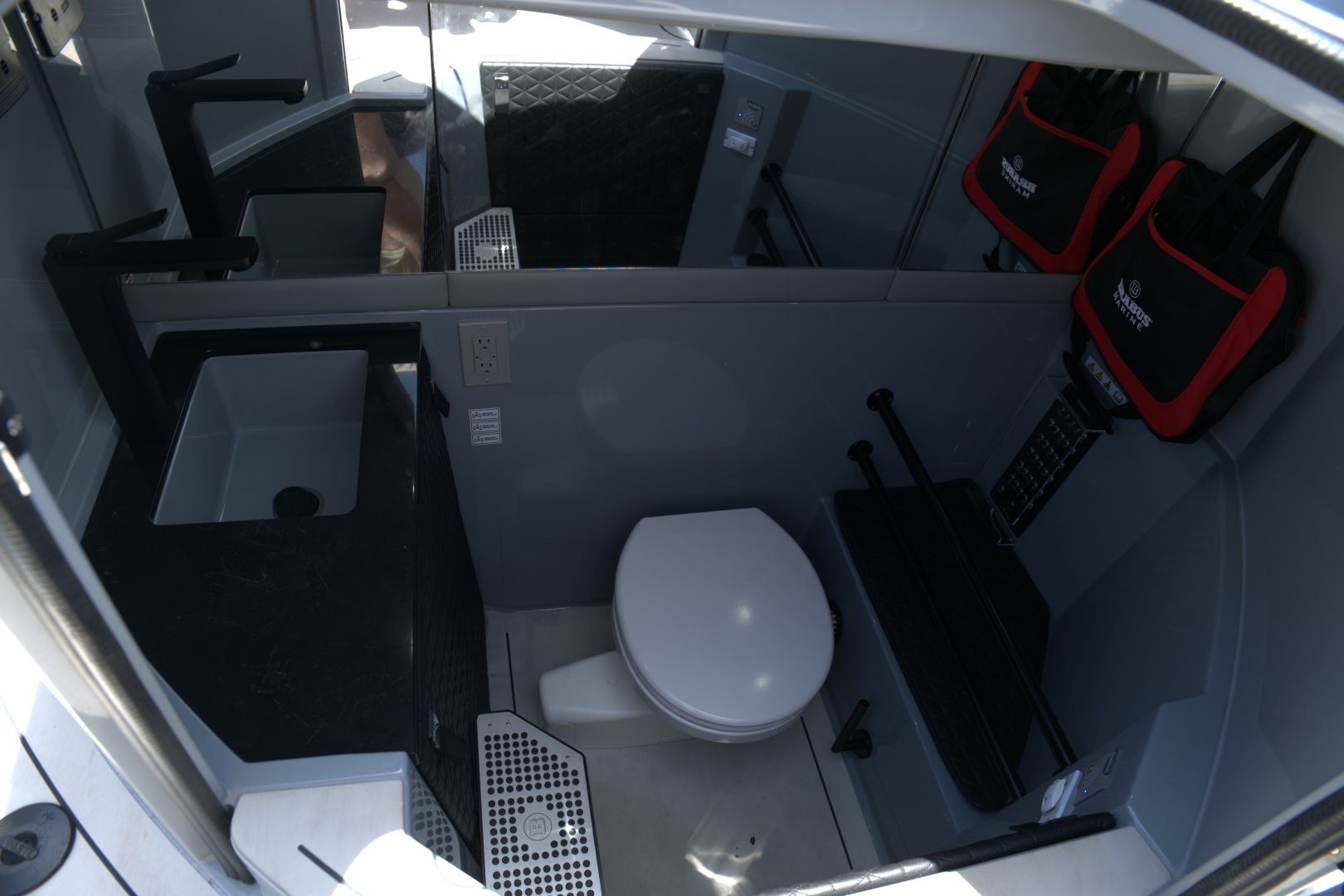 Boarding at the stern, you will note the Mercury Racing edition V8 250HP engines with a black powdercoated towing point above them. Synthetic grey decks run the length of the vessel with heavy duty rubber rub rails surrounding the hull.The aft cabin is accompanied by a diamond stitched red sunpad above it, with diamond stitched seats to port and starboard with storage beneath.Four bucket seats sit midship and directly behind two additional inset helm seats.Access to the cabin is below the center two guest seats with a lifting gas shock assisted door.The arch top covers all the guests and leaves room for walkthroughs to the bow seating area.The entire bow can serve as a sunpad, or can be modified for a cocktail table insert to starboard.Directly in front of the helm is a recessed head and storage area with a sink and vanity.