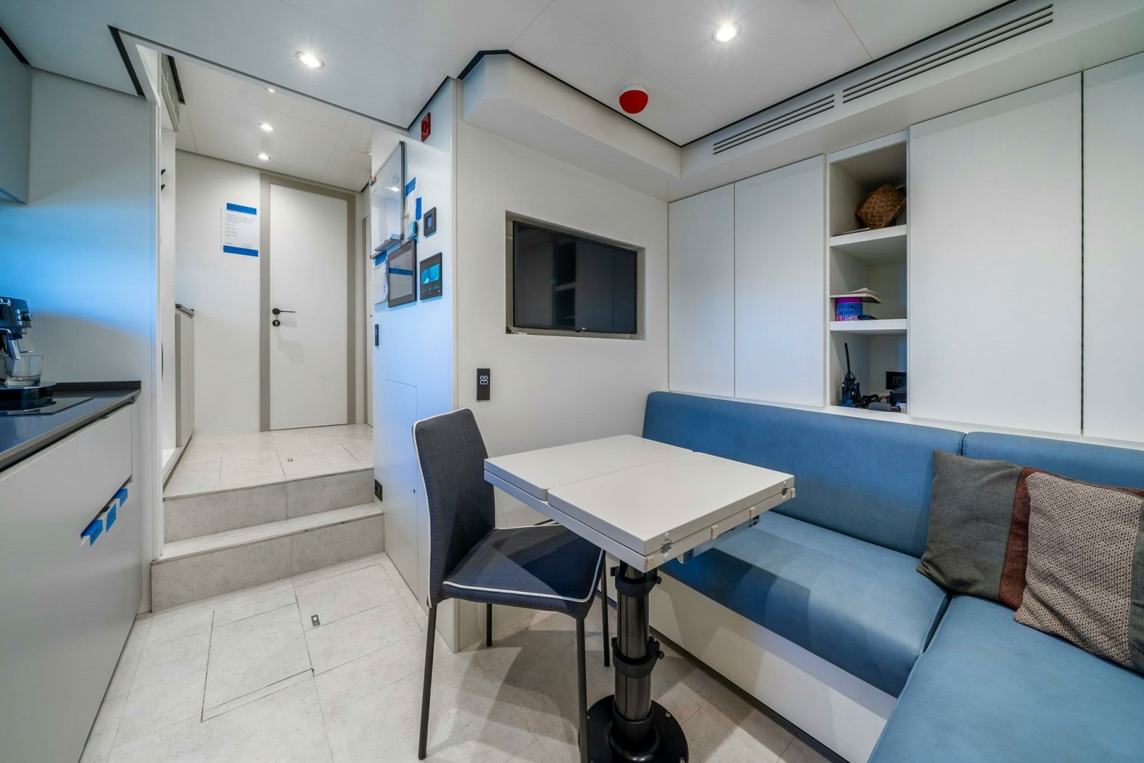 LAUNDRY AND CREW CORRIDOR► Washing Machine Miele► Dryer Miele► Cabinet with door, shelve and drawer► LED ceiling spotlights 24 Vdc► Lighting control points► Sockets► Fire sensor► Lacquered mat ceiling► Exit door to side deck