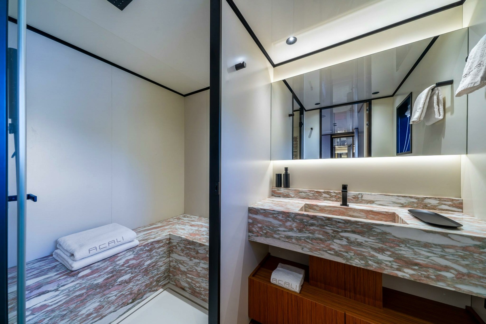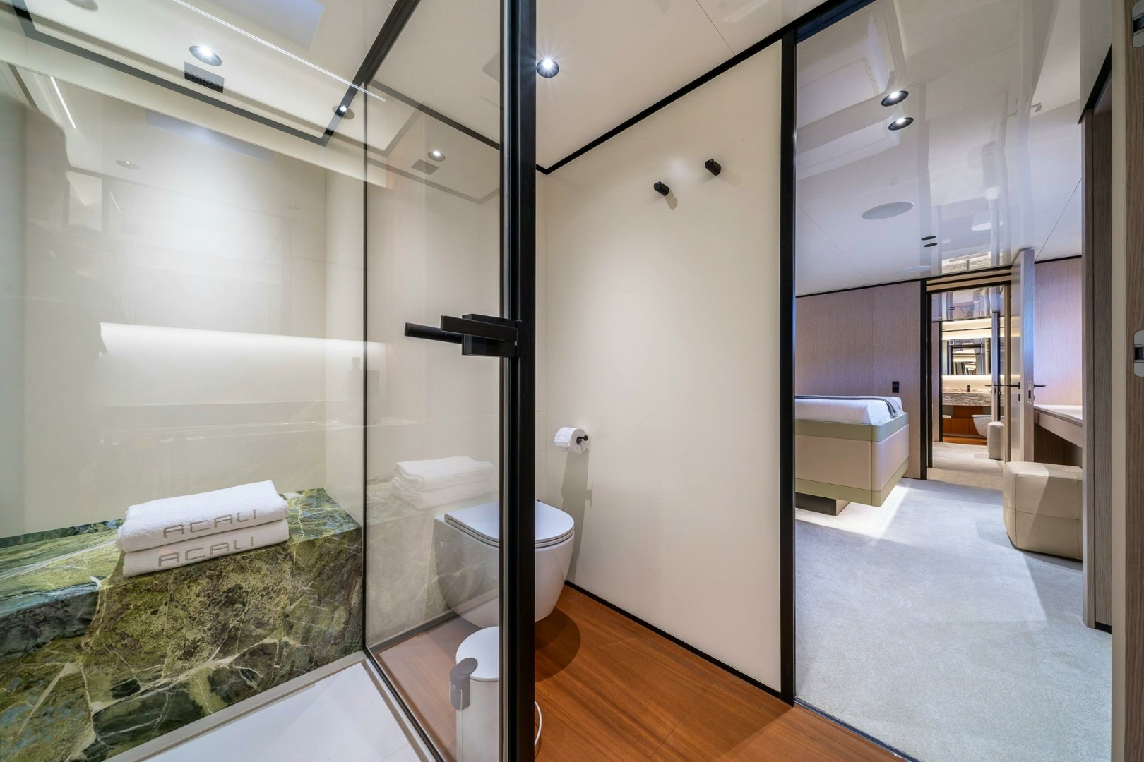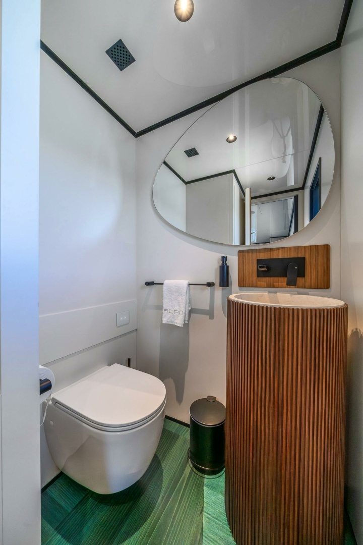VIP CABIN BATHROOMS (2)► Shower (glass door, Corian® tray)► Wall-mounted shower head► Hot/cold water mixer with handheld shower head► Fixed glass window► Wood flooring► Built-in washbasin with Corian® top, with extra marble finish