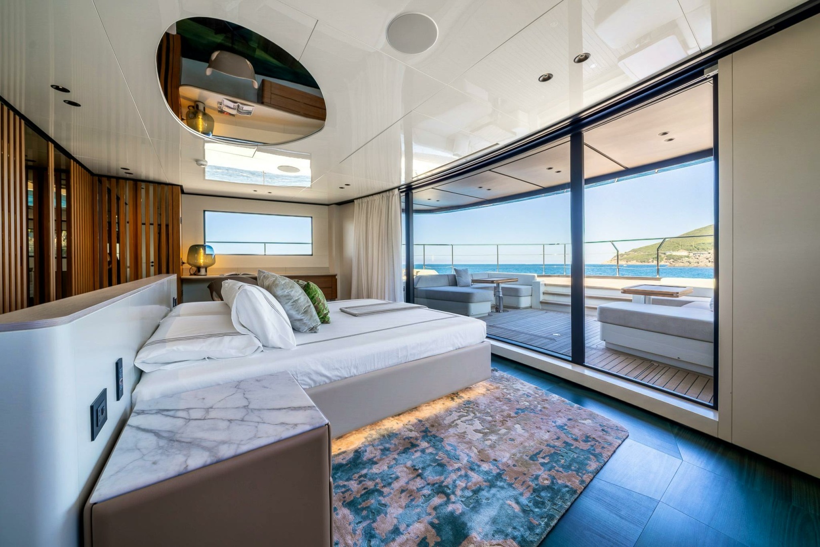 VIP CABINS (2)► Air conditioning► Air handling unit► Wood wardrobe (1) with hanging rod and shelves► Bedside table (2) with drawer► Fixed window► King bed (1) (mattress, pillows, bed cover)► LED ceiling spotlights 24 Vdc► Bed frame LED strip 24 Vdc► Reading lights (2)► Wardrobe lights with microswitch (2)► Motorised retractable 43” Smart TV► Lighting control points (4)► Roller control points (2)► Sockets (2)► USB charging ports (2)► Carpet flooring► Pleated curtain► Electric blackout roller blinds► Padded leather headboard► Cabinet/desk with armchair► Watertight door for access to beach club balcony► Fire sensor► Teak wood ceiling► B&O Core Multiroom (share music in all the B&O Zonethrough B&O App for smartphone or tablet)