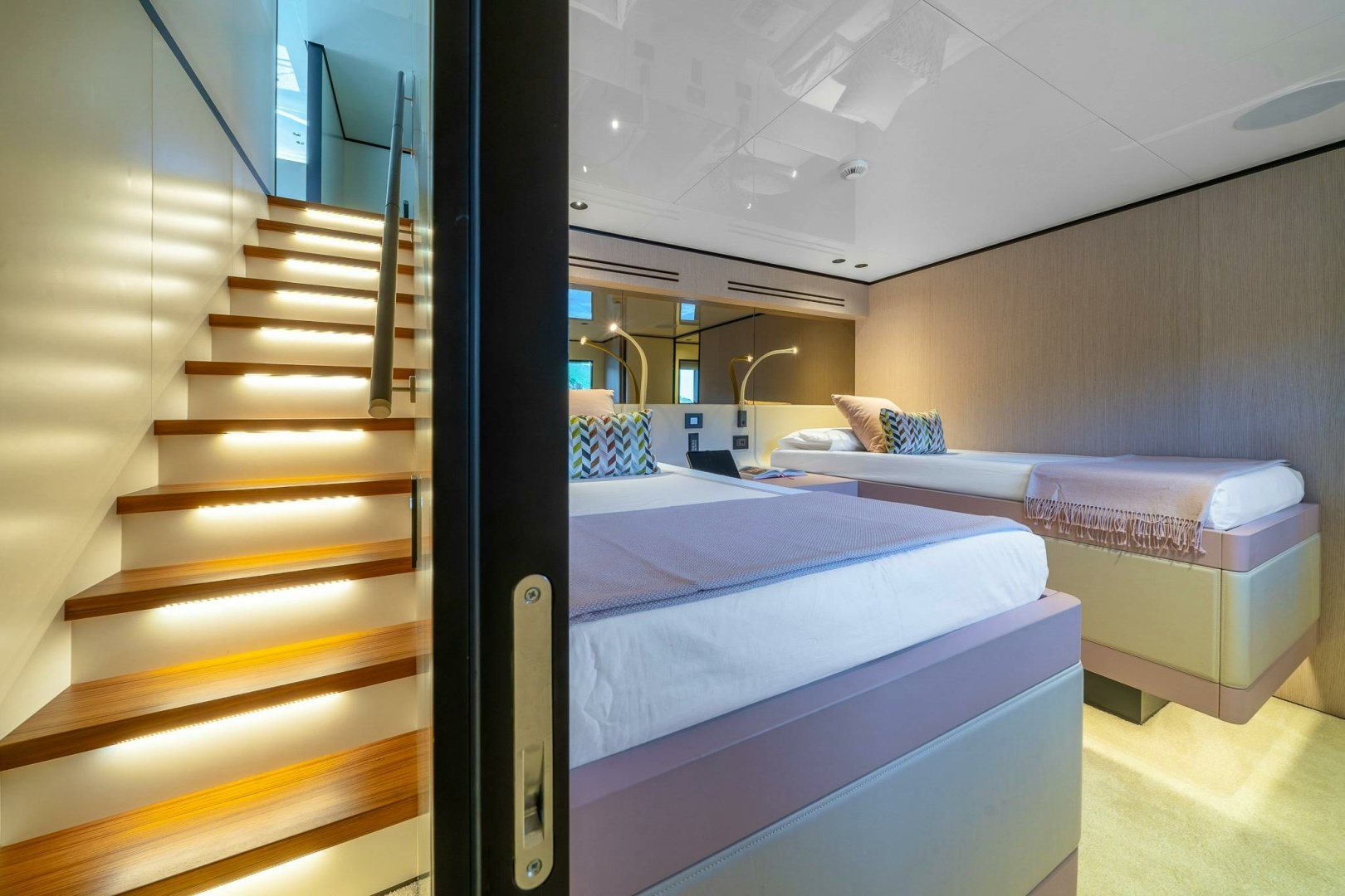 GUEST CABIN (1)► Air conditioning► Air handling unit► Wood wardrobes (2) with hanging rod and shelves► Bedside table with drawer► Fixed window► Single beds (2) (mattress, pillows, bed cover) with leatherbed frame► LED ceiling spotlights 24 Vdc► Bed frame LED strip 24 Vdc► Reading lights (2)► Wardrobe lights with microswitch (2)► Motorised retractable 43” Smart TV► Lighting control points (4)► Roller blinds control points (1)► Sockets (2)► USB charging ports (2)► Carpet flooring► Pleated curtain► Electric blackout roller blinds► Padded leather headboard► Cabinet/desk with armchair► Fire sensor► Teak wood ceiling► B&O Core Multiroom (share music in all the B&O Zone through B&O App for smartphone or tablet)