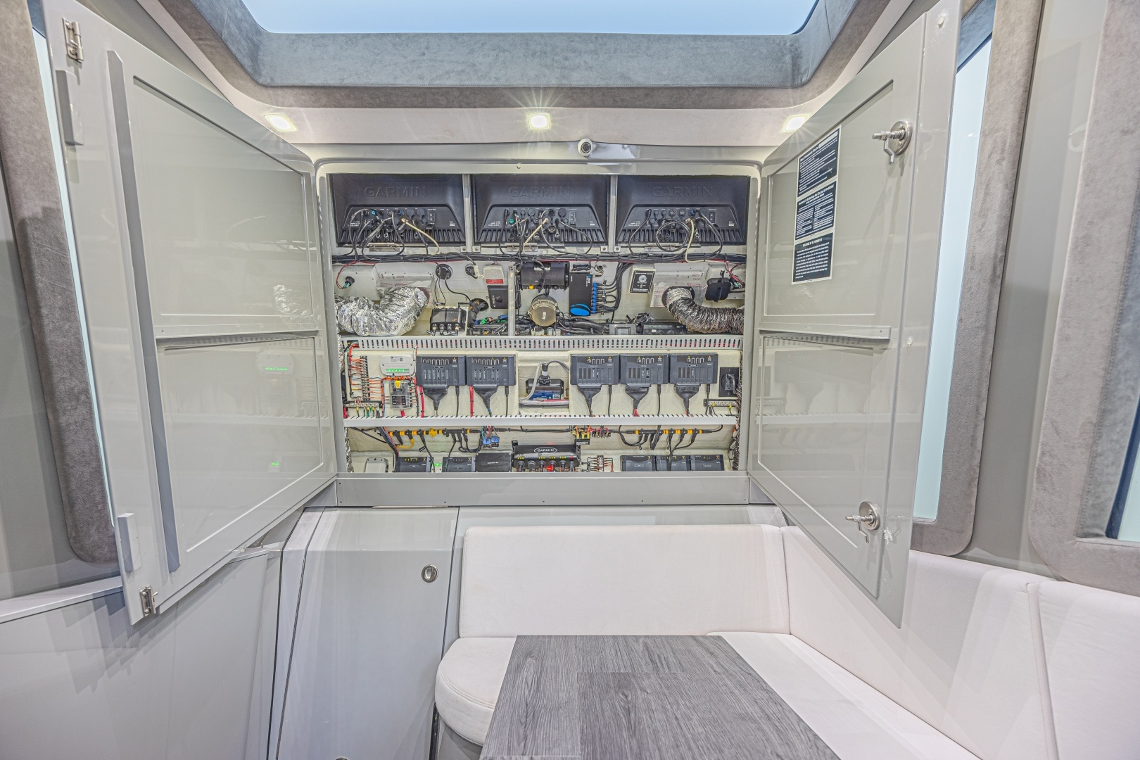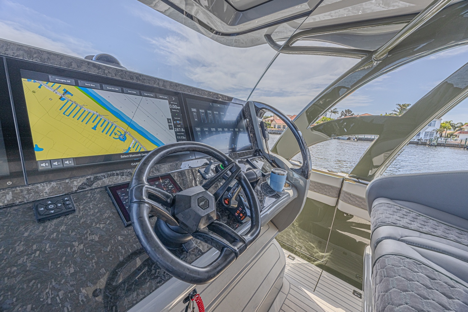The cockpit:The deck is laid out for both fishing and fast‑cruise comfort, with large non‑skid surfaces, integrated insulated fishboxes and livewell options, ample tackle and rod storage, and transom access tailored to the engine bracket. Lighting includes cockpit courtesy and optional underwater fixtures, while practical features such as raw water washdown, pumpouts and dedicated storage are integrated into the design. The center‑console helm is ergonomically arranged with elevated seating/leaning post options; electronics package is set up with 3 massive 22inch multi‑function Garmin displays, radar, autopilot, VHF and AIS, plus a premium stereo system for helm and cockpit audio.