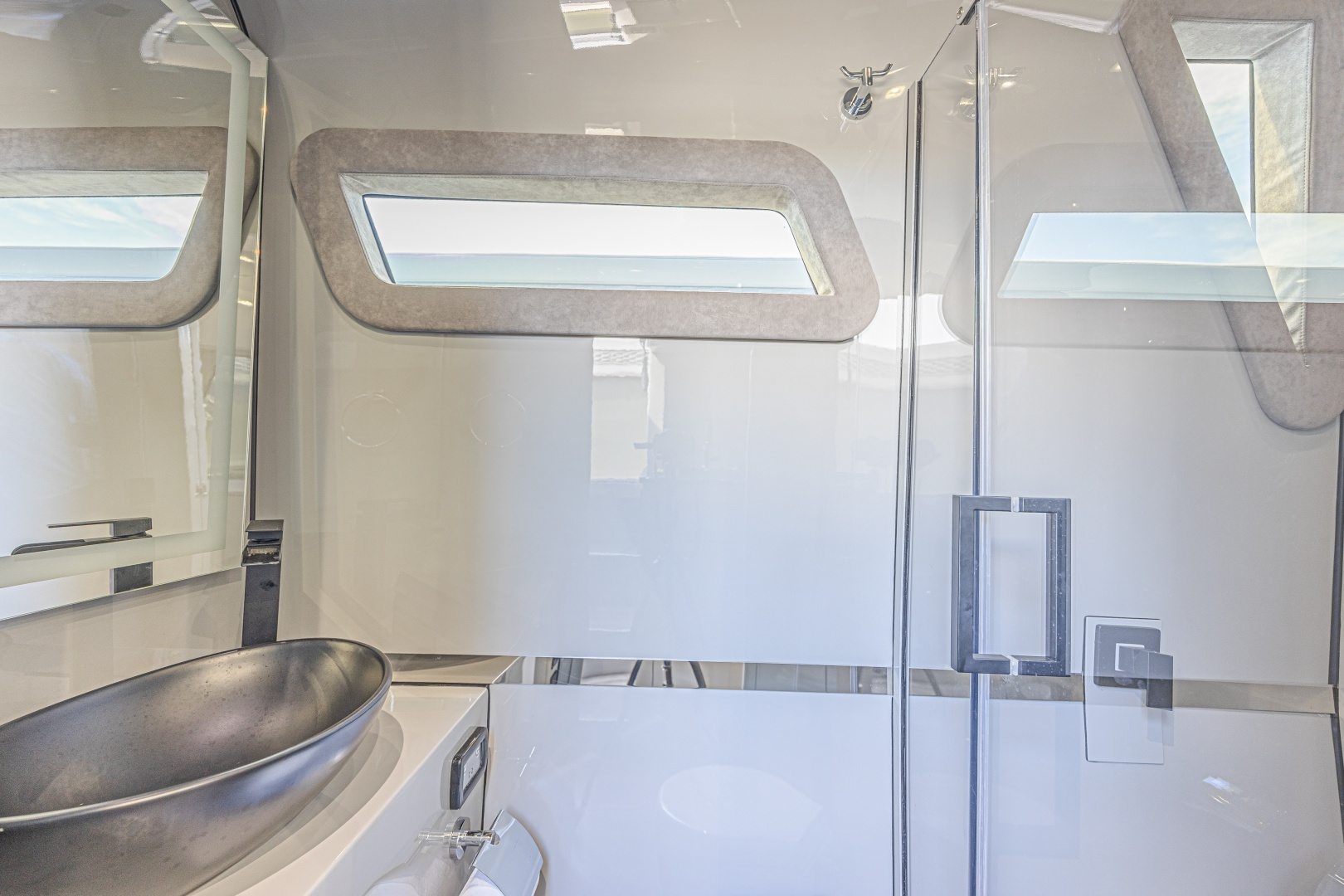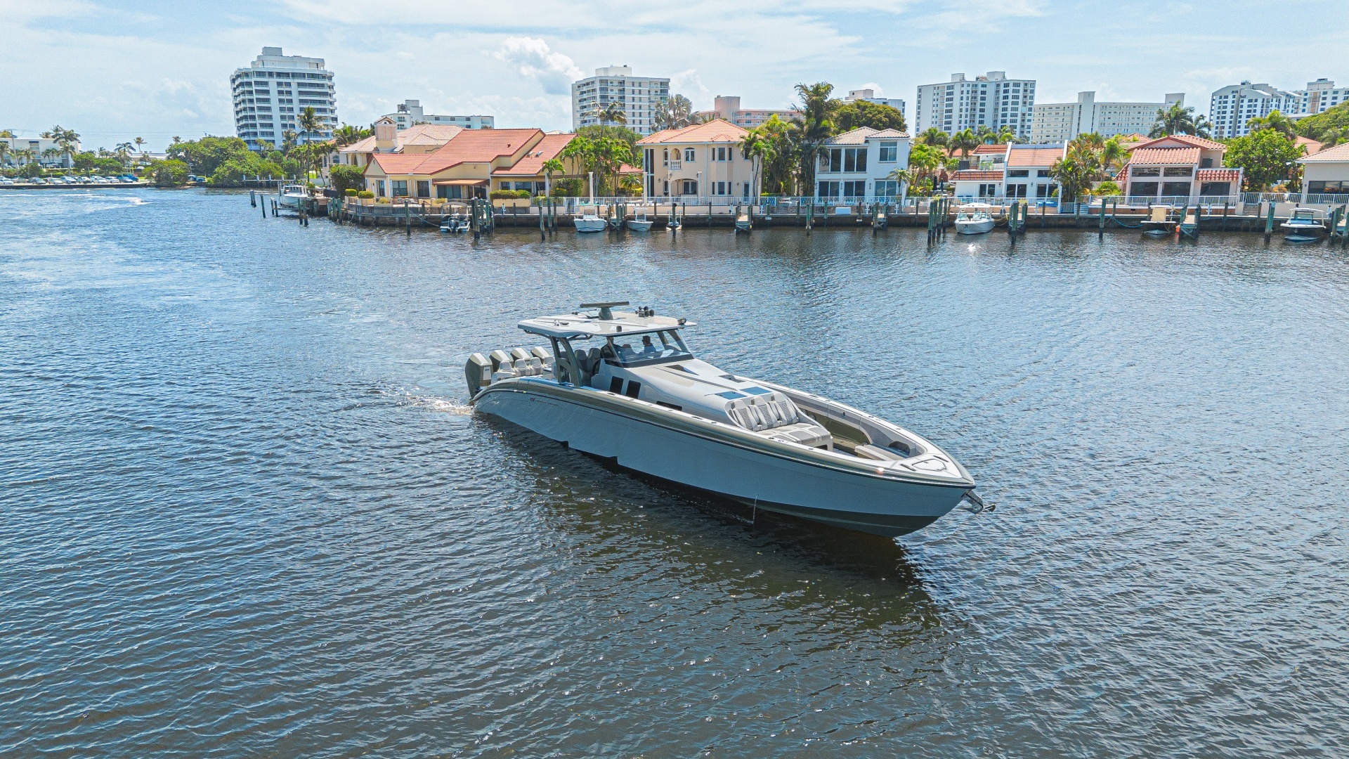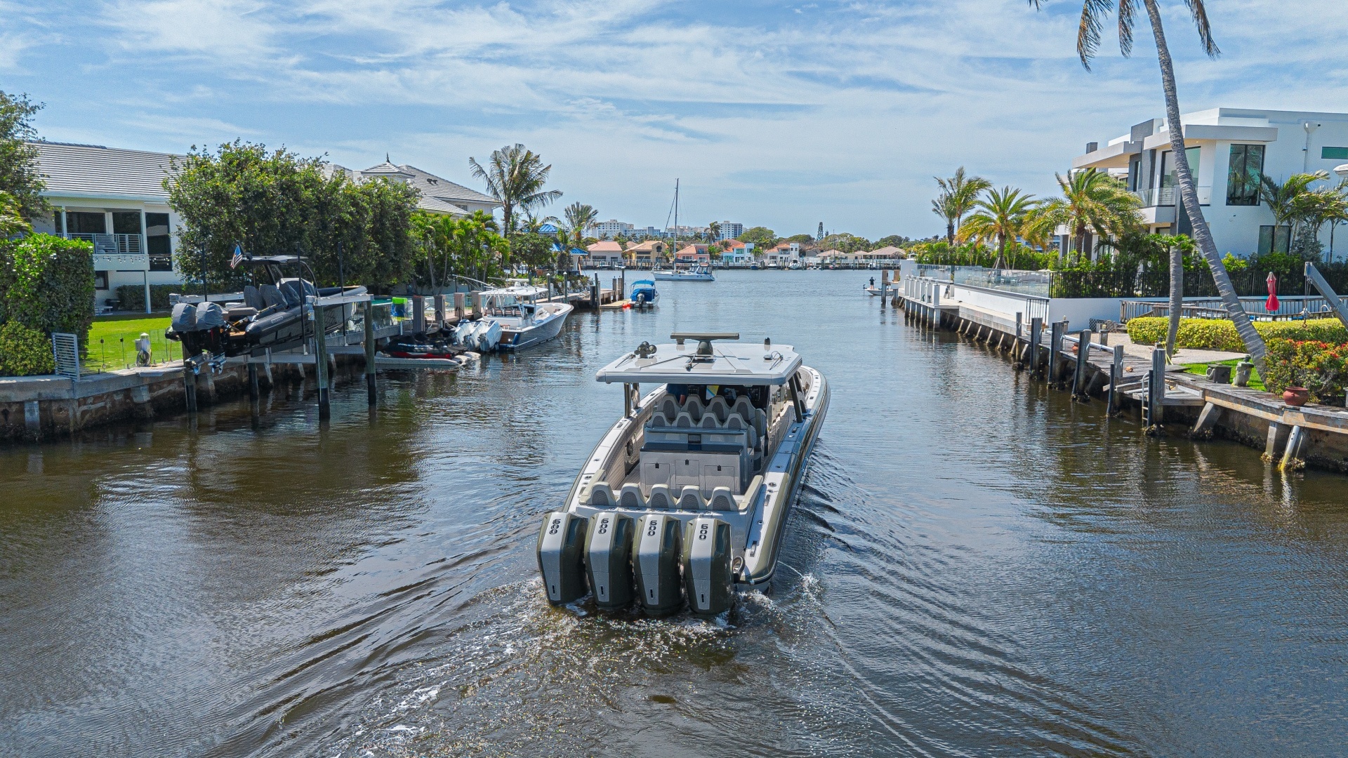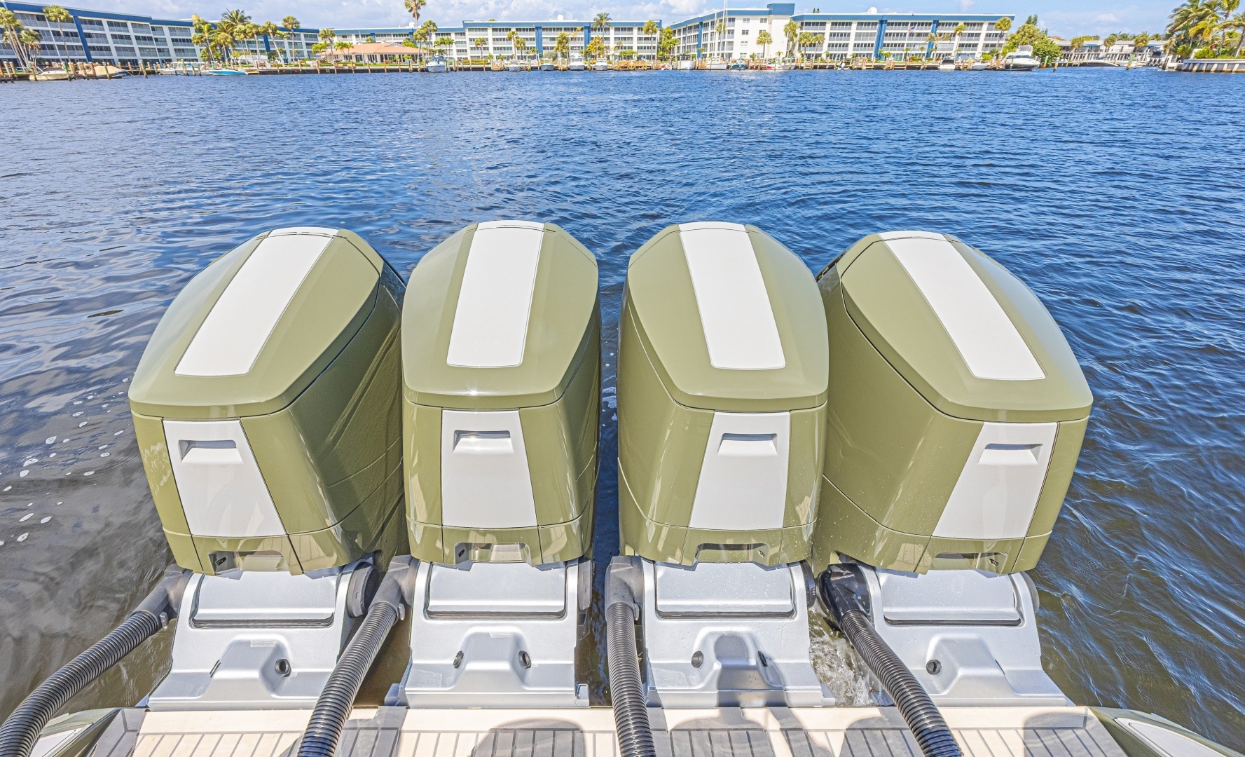 The propulsion package:Consists of four 2025 Mercury V12 600 outboards with a two step transmission, each with full digital engine monitoring via Mercury VesselView displays, electric steering and joystick docking controller paired with a bow thruster making this boat very easy to handle and manuver in tight quarters and high current/wind situations.