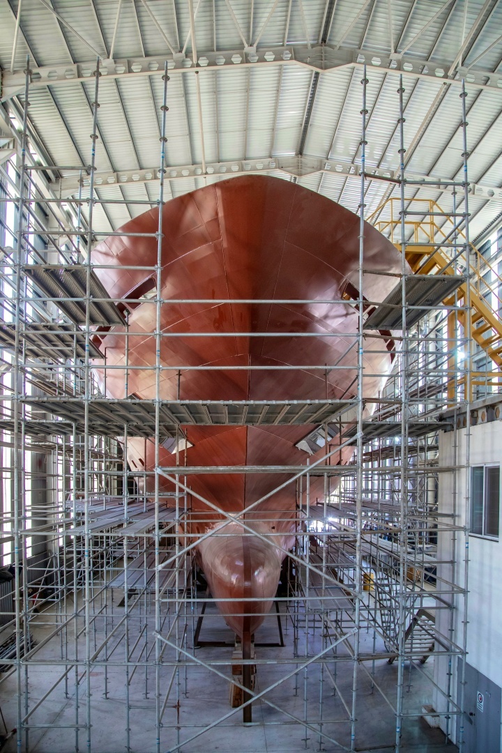 - Rudder tubes have been installed and welded. Twin rudder shafts and blades have been installed.